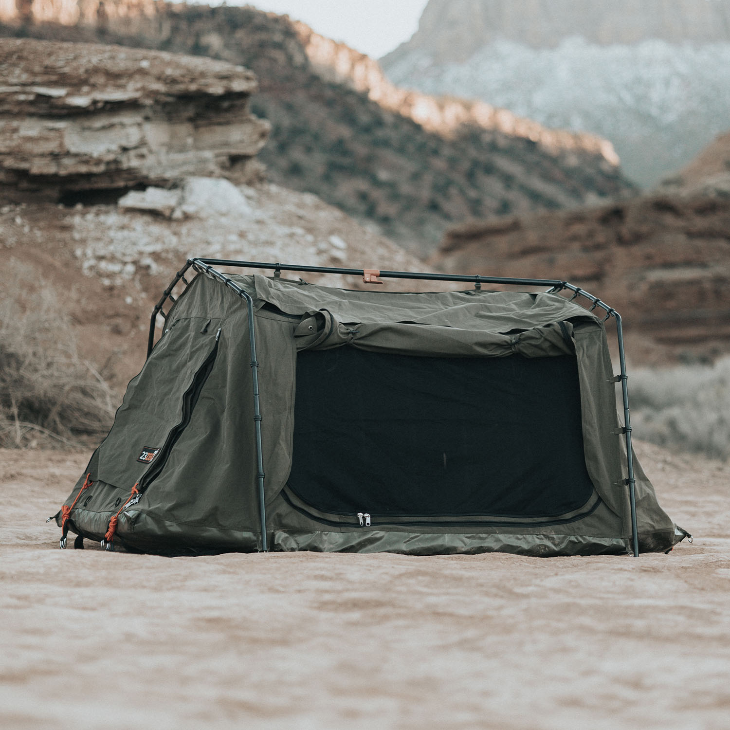 The perfect four season touring swag style tent big enough to accommodate two large adults.